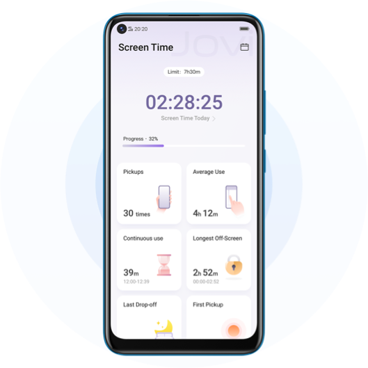 Bạn tốn quá nhiều thời gian vào chiếc điện thoại? Tính năng Jovi Quản lý thời gian ứng dụng giúp ghi lại thời gian sử dụng điện thoại, thời gian xem trung bình, thời gian sử dụng ứng dụng của bạn.